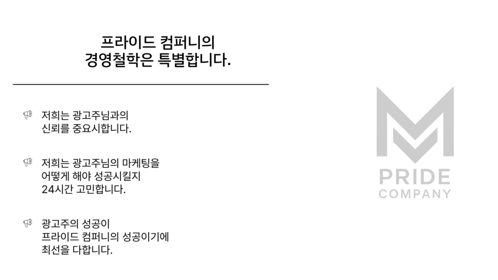 프라이드컴퍼니는 광고주와의 신뢰를 중요시하는 기업입니다.